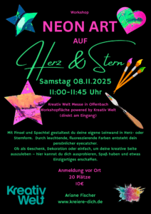 Am Samstag, den 02.09.2023, 30.09.2023 und 07.10.2023 von 14:00-19:00 Uhr gebe ich in Kooperation mit "eyecandy Frankfurt" einen kostenlose Workshop Acrylmalen für Kinder unter dem Motto: "Bunt, bunter, neon".